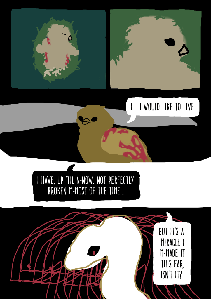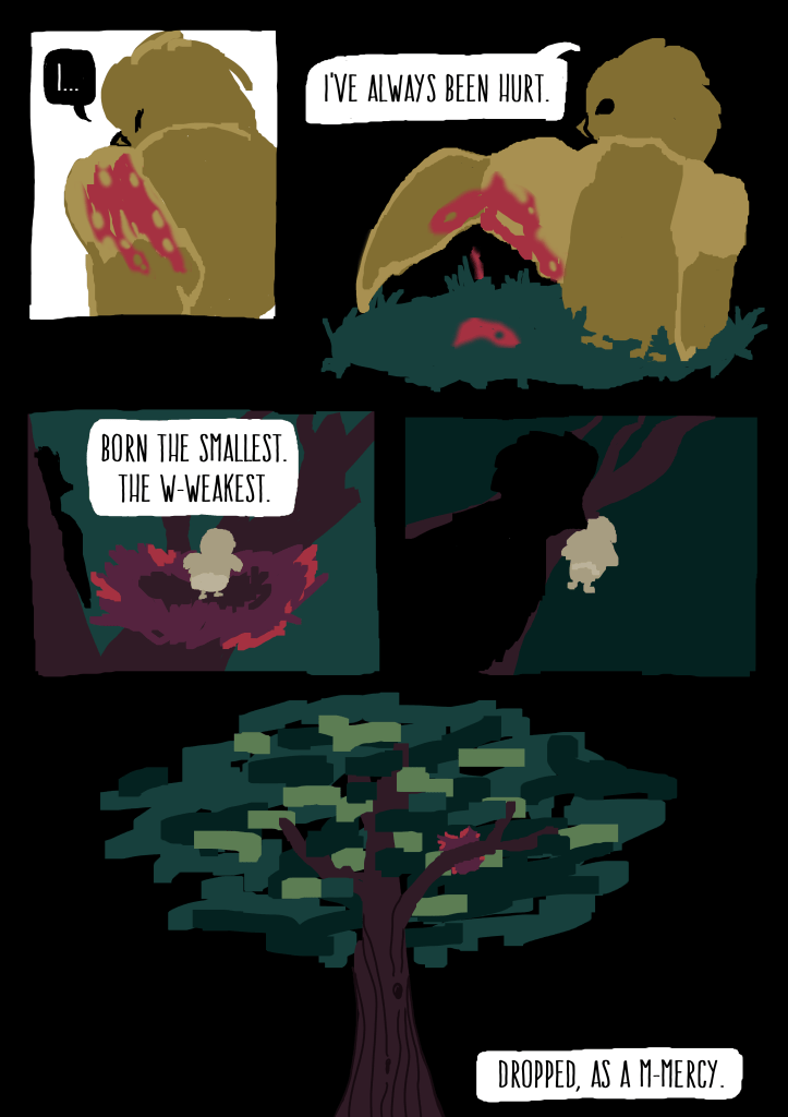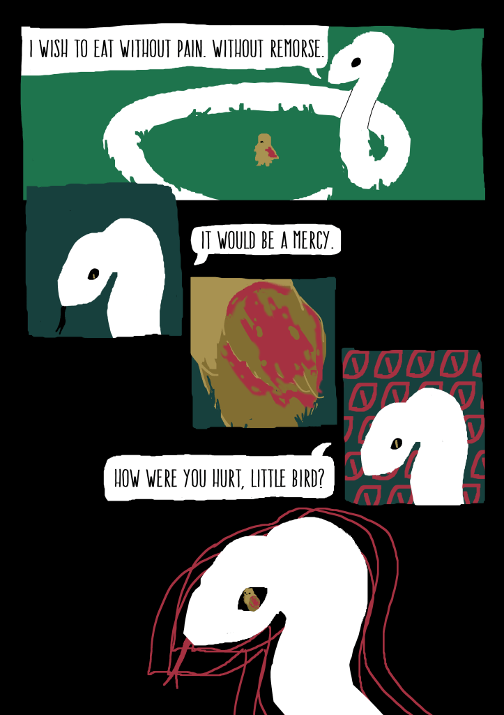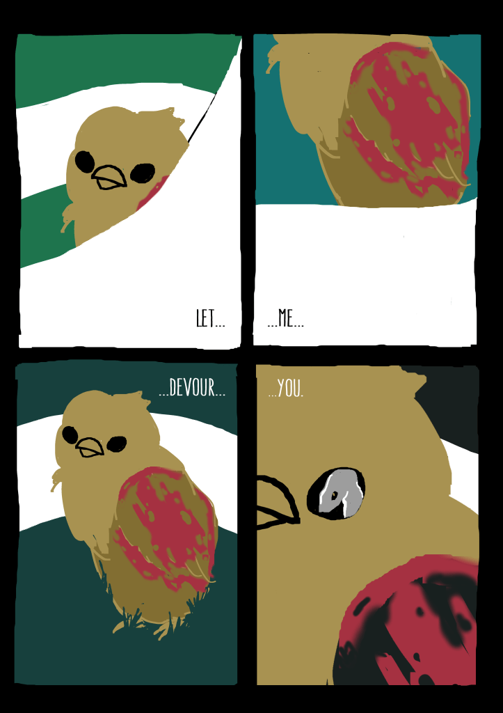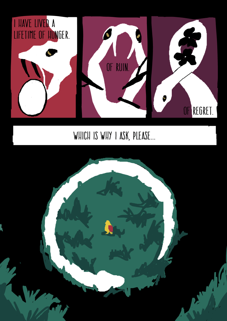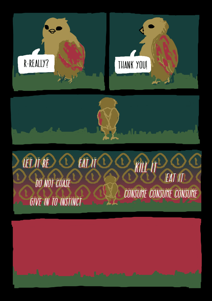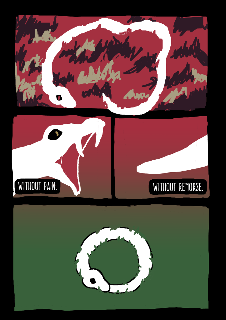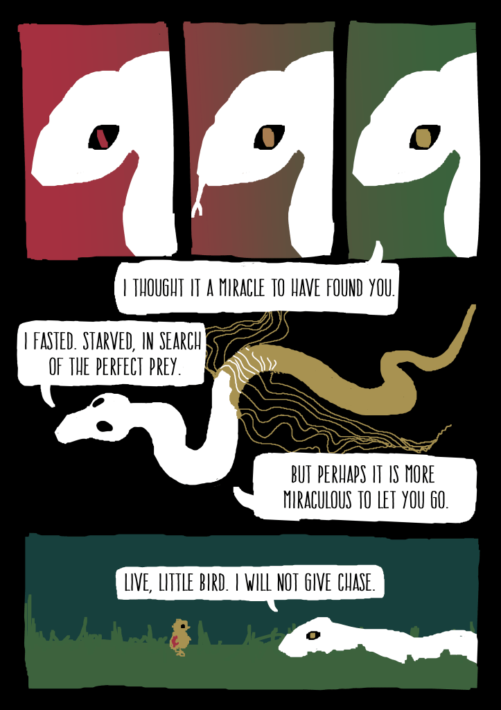 I wrote and illustrated “Prey” as a final project for a Comics & Graphic Novels class taken with UCLA Extension (shout-out to Prof. Brian!). I wanted to evoke those timeless Aesop fables with animal characters, and contrast the story’s somber, philosophical tone with vibrant, surreal imagery.